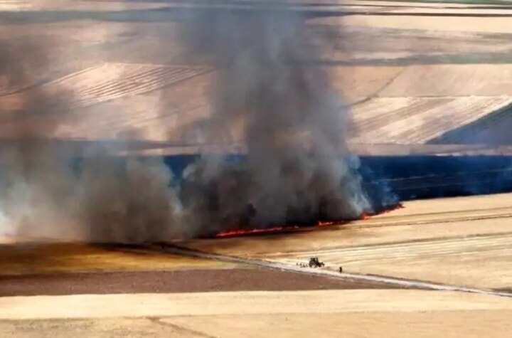 Elazığ'ın Çip köyü Harmantepe Küme Meskenleri mevkiinde çıkan yangın, ekili arpa ve buğday alanlarını...
