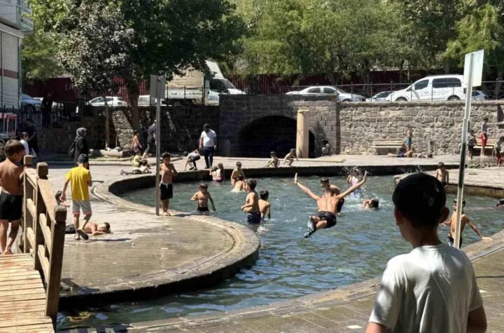 Diyarbakır'da hava sıcaklığının 40 dereceyi bulmasıyla birlikte çocuklar, serinlemek için Anzele Parkı'ndaki süs havuzuna...