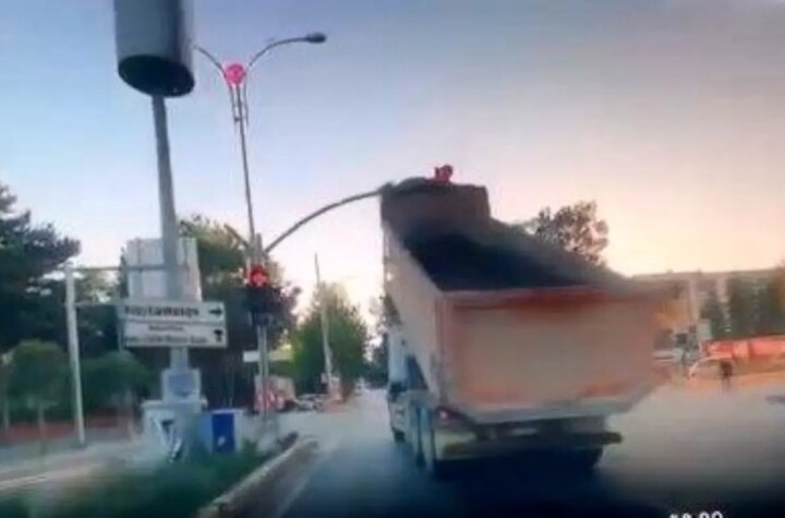 Elazığ'da damperi açık unutulan bir kamyon, trafik ışıklarına çarparak olay yerinden kaçtı. Olay anı...