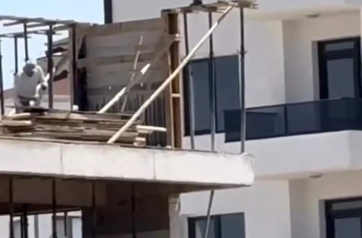 Elazığ'ın Çaydaçıra Mahallesi'nde inşaat halindeki bir binanın son katında güvenlik tedbiri almadan çalışan emekçiler,...