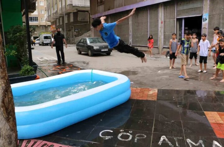 Diyarbakır'da 45 dereceyi aşan hava sıcaklıkları nedeniyle bir esnaf, çocukların serinlemesi için iş yerinin...
