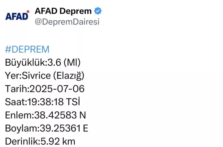 Elazığ'ın Sivrice ilçesi, 3.6 büyüklüğünde bir sarsıntıyla sarsıldı. Afet ve Acil Durum İdaresi Başkanlığı...