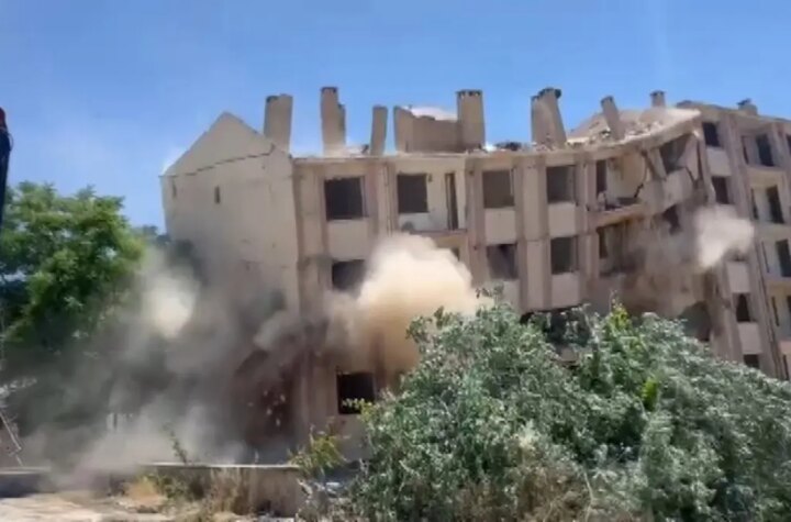 Elazığ'da 6 Şubat sarsıntılarında ağır hasar gören 5 katlı apartmanın denetimli olarak yıkımı gerçekleştirildi.