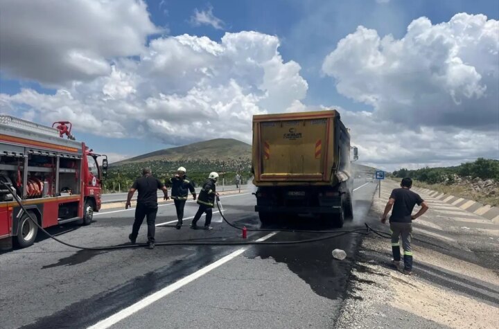 Elazığ'ın Karakoçan ilçesinde seyir halindeki bir kamyonun damperinde çıkan yangın, itfaiye takımları tarafından denetim...