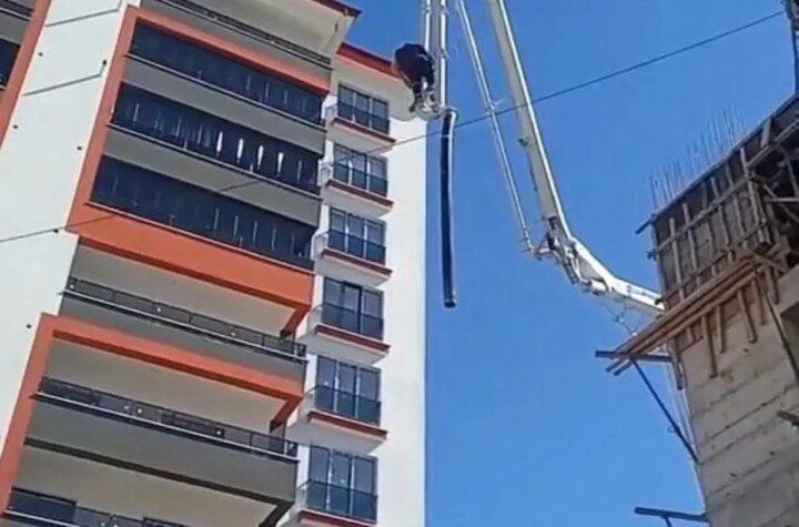 Elazığ'da inşaat halindeki bir binada, bir personel beton pompa hortumuna binerek metrelerce yüksekliğe çıktı....