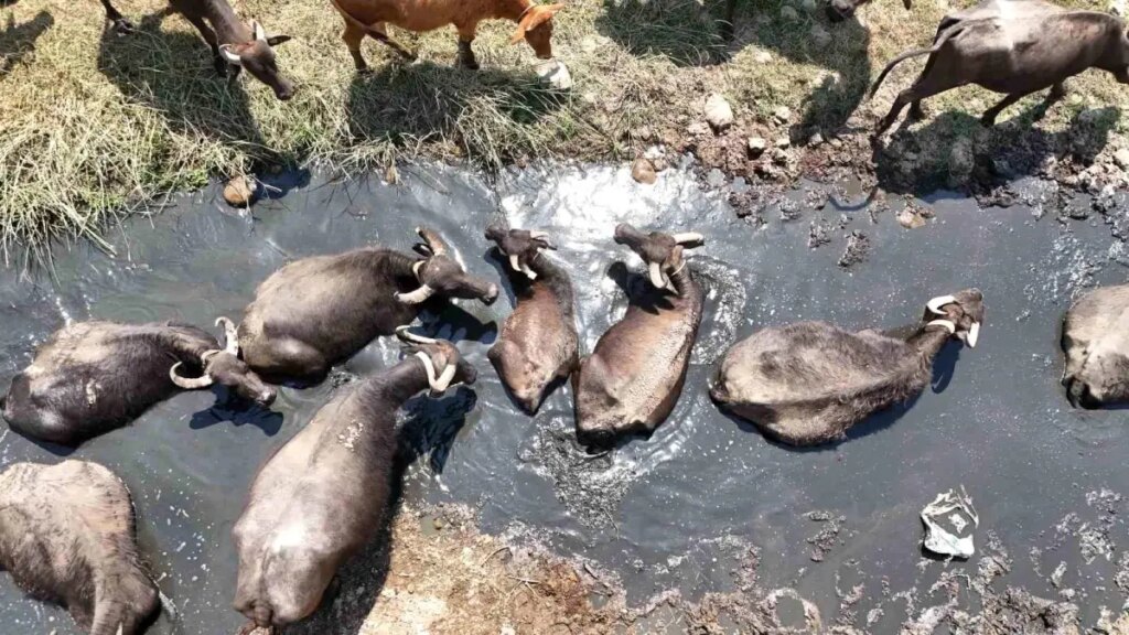 Diyarbakır'da 45 dereceyi aşan hava sıcaklıkları, çiftlikteki mandaların günde 5 saat gölette serinlemeleriyle başa çıkmalarına neden oluyor. Besici, su eksikliğinin hayvanların gelişimini olumsuz etkilediğini belirtiyor.