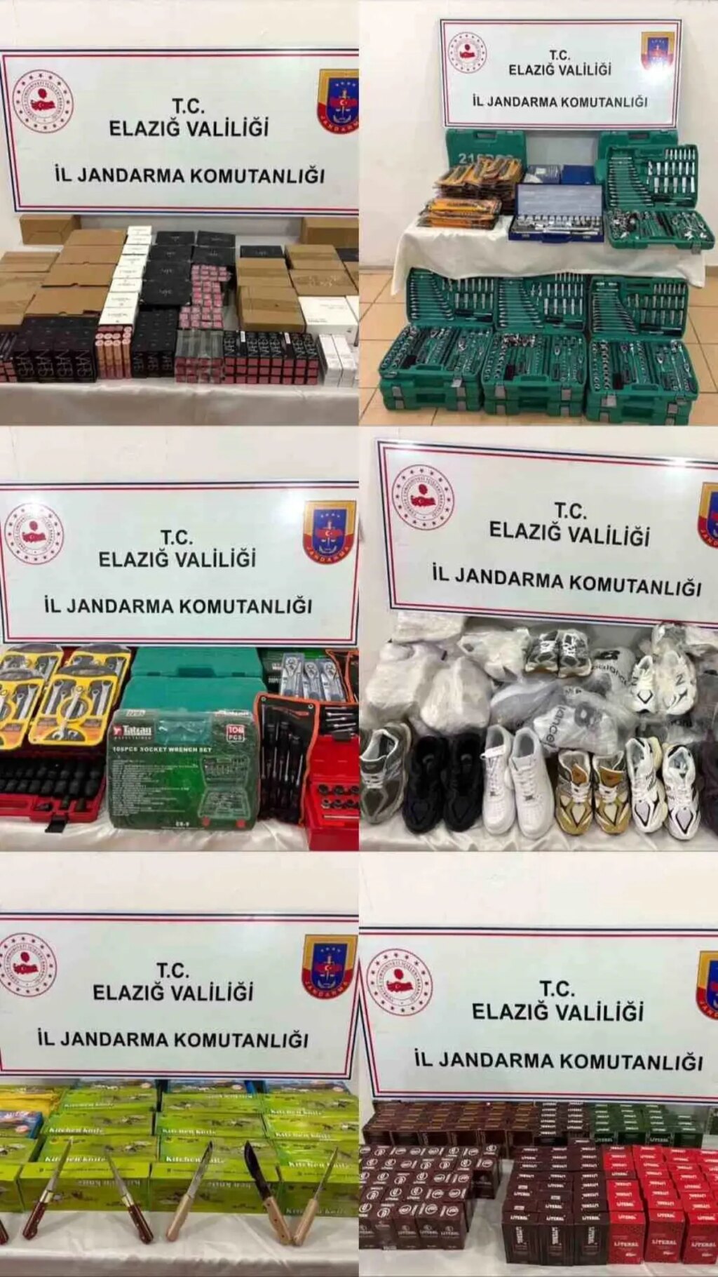 Elazığ Vilayet Jandarma Komutanlığı grupları tarafından yapılan çalışmalar sonucu Gezin yol denetim uygulamasında bir kargo firmasına ilişkin kamyon içerisinde yapılan arama sonucunda 6 şahsa ilişkin faturasız gümrük kaçağı olduğu bedellendirilen piyasa pahası yaklaşık 1 milyon 450 TL olan; 45 adet spor ayakkabı, 408 adet bıçak, 206 adet çeşitli tamir aleti, 154 adet parfüm, 480 adet kozmetik eseri ele geçirildi.