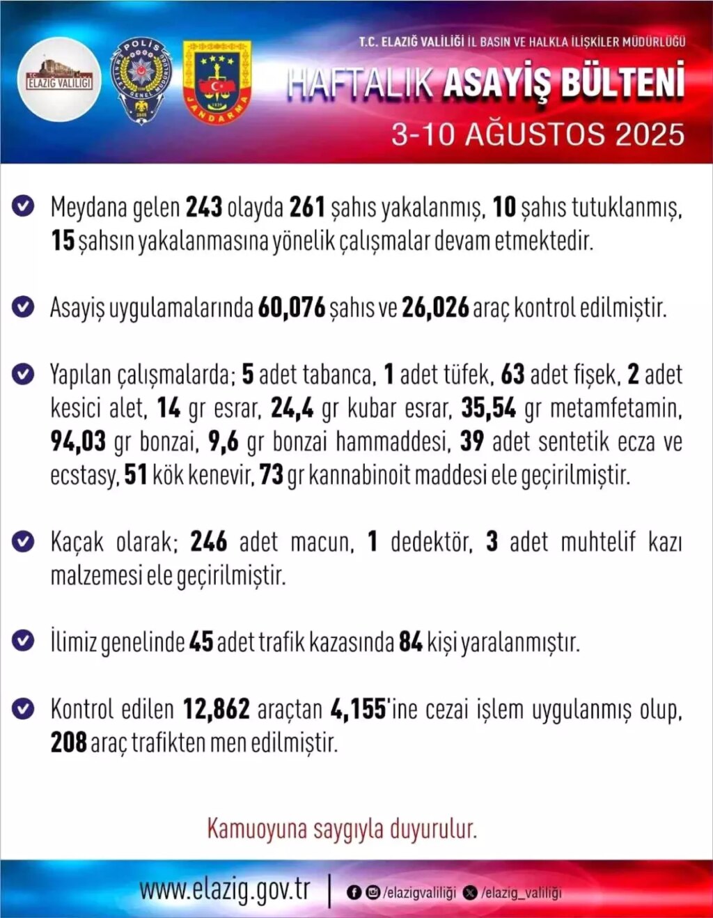 Elazığ Valiliği, 3-10 Ağustos 2025 tarihleri ortasındaki haftalık asayiş datalarını açıkladı. Kent genelinde meydana gelen 243 olayda 261 kişi yakalanırken, 10 kişi tutuklandı.