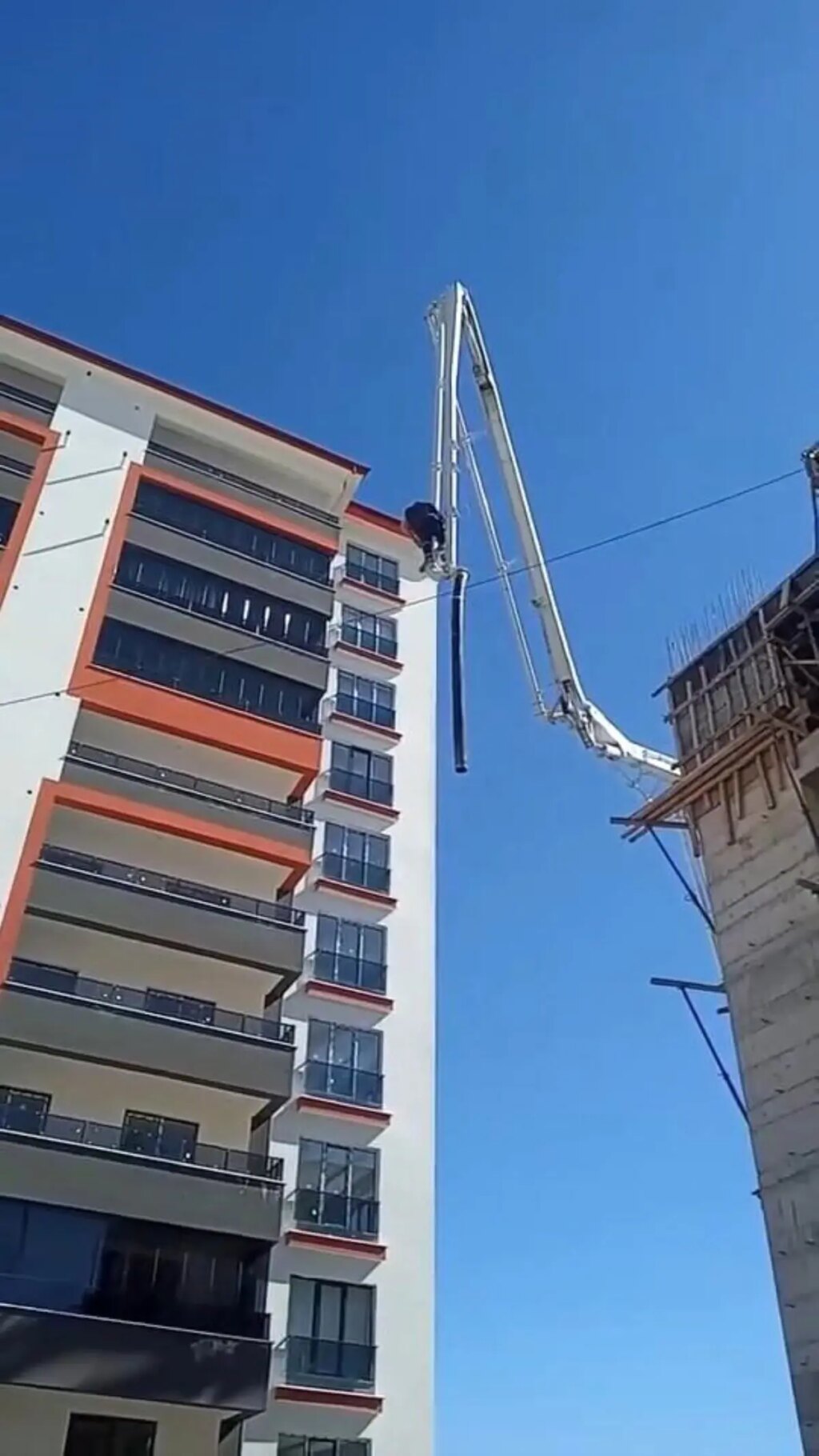 Olay, Elazığ’da inşaat halindeki bir binada meydana geldi. Edinilen bilgiye nazaran, devam eden bir inşaata harç götüren firma mikser ve pompa ile binaya beton atmaya başladı. Bu sırada ismi öğrenilmeyen bir personel ise pompa hortumunun üzerine çıktı. Pompa yaklaşık 10 katlı binanın uzunluğuna yükselirken, personel adeta mevte meydan okudu. Çalışanın tehlikeli hareketi cep telefonu kamerasına yansıdı. – ELAZIĞ