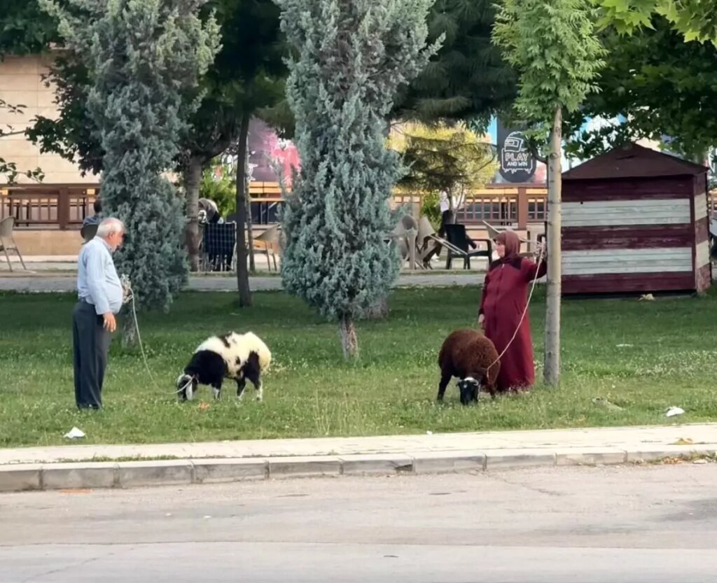 Elazığ’da yaşlı bir çiftin besledikleri koyunları tasma takarak gezdirmesi renkli imajlar oluşturdu. Kültür Park mevkiinde koyunlarını besleyen çiftin o esnada birbirleriyle sohbet etmesi bir vatandaşın cep telefonu manzarasına yansıdı. Çimenlerde bir mühlet koyunlarını otlatan çift, daha sonra gözden kayboldu. – ELAZIĞ