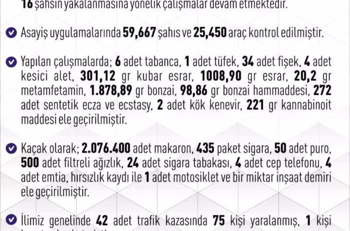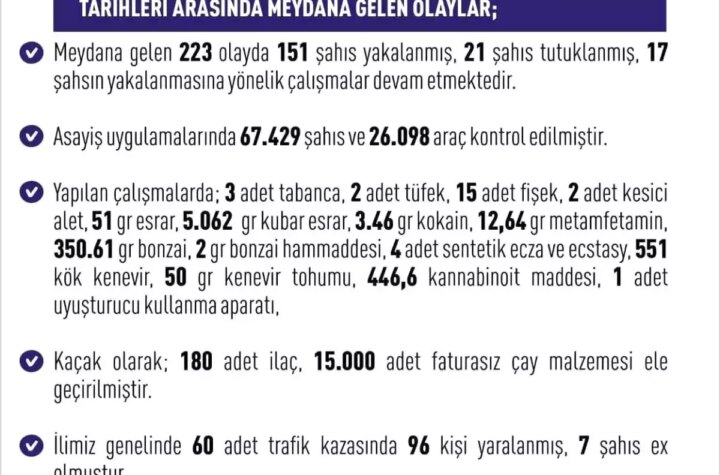 Elazığ'da son bir haftada meydana gelen 223 asayiş olayında 151 kişi yakalanırken 21'i tutuklandı....