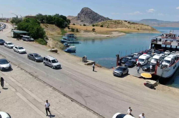 Kurban Bayramı'nın son gününde tatil dönüşüne geçen vatandaşlar, Elazığ-Pertek feribot iskelesinde uzun araç kuyrukları...