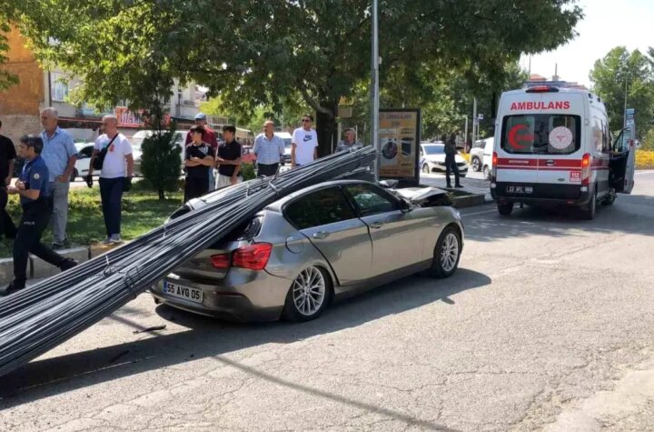 Elazığ'da kırmızı ışıkta bekleyen lüks arabanın üzerine inşaat demiri yüklü tırın yükü düştü. Kazada...