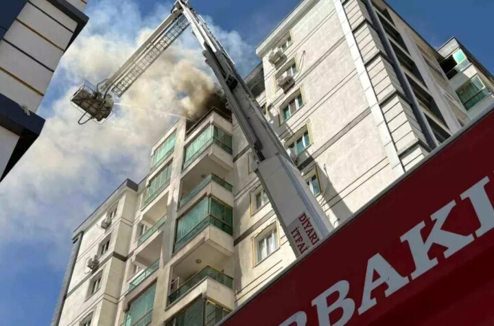 Diyarbakır'ın Bağlar ilçesindeki 8 katlı bir apartmanın son katında çıkan yangında, itfaiye takımları yangına...