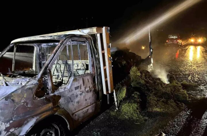 Malatya'nın Arguvan ilçesinde seyir halindeki yonca yüklü bir kamyonette çıkan yangın, itfaiye takımlarının müdahalesiyle...